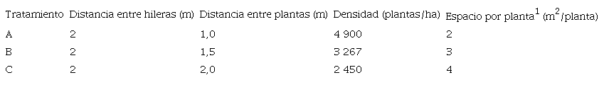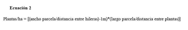 Por su parte, la cantidad de plantas por hectárea fue calculada a partir de las distancias entre plantas y entre hileras (Ecuación 2).