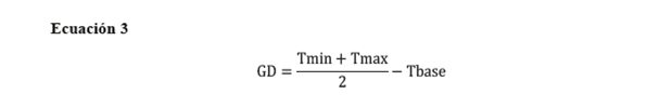 Grados día. Con el objetivo de establecer el acumulado de grados día necesarios para que el cultivo de mucuna llegara a cada etapa de desarrollo, se utilizaron los datos de la temperatura horaria de la estación meteorológica ubicada en la EEAFBM. Los grados día fueron calculados a partir de la temperatura diurna máxima y mínima (Ecuación 3).