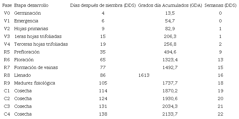 La etapa reproductiva R6, según la escala elaborada, se alcanzó a partir de la semana 13. El patrón de lluvias sugiere que la época de siembra elegida fue adecuada. De acuerdo con Araya y Hernández (2003), las etapas vegetativas deben coincidir con la época de lluvias y las etapas reproductivas deben experimentar una disminución en la precipitación. Durante la etapa reproductiva, la partición de asimilados vulnera a las hojas de padecer de enfermedades de follaje (Agrios 2005). Por ello, una disminución del régimen de precipitaciones tiende a mantener las plantas más sanas, lo que se traduce en mayor rendimiento (Ferreiraet al. 2013).