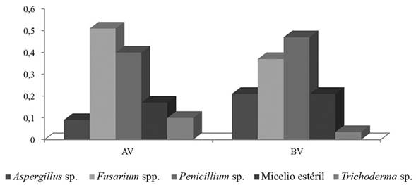 Con respecto a la diversidad de hongos encontrados en la Figura 1, se presentan los resultados en lotes de vigor contrastantes. La biodiversidad fúngica predominante en suelos cultivados con plátano en la zona Sur del Lago estuvo representada por 4 hongos que se identificaron como:Aspergillussp,Fusariumspp,Penicilliumsp yTrichodermasp. Así, de los hongos identificados, no se observaron diferencias estadísticas entre los suelos cultivados con plantas de plátano de diferente vigor para UFC deFusariumspp.,Penicilliumsp. Micelio estéril yTrichodermasp. Sin embargo, en el lote de AV se evidenció un valor más elevado de UFC paraTrichoderma. Por otra parte, se identificaron mayor UFC deAspergillussp. en suelos con lotes de BV respecto a los de AV.