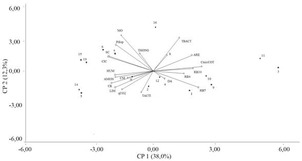 Para adoptar una decisión definitiva en la selección de las variables, fue necesario examinar los vectores propios entre las variables originales y los componentes principales, aspecto que indica que las variables con los valores más altos en los componentes seleccionados serán las de mayor importancia (Pla 1986). En este sentido, al evaluar los vectores propios de la matriz correlación de las 20 variables edáficas evaluadas, se observaron altos valores para 15 de ellas (conductividad eléctrica, materia orgánica, carbono microbiano, respiración basal a los 4, 7 y 10 días, fósforo disponible, capacidad de intercambio catiónico, densidad aparente, población total de hongos, bacterias y actinomicetos, % de arena y limo, coeficiente metabólico). Con base en estas variables, se realizó el biplot multivariado para evaluar las interrelaciones entre las variables y los lotes de alto y bajo vigor del cultivo de plátano.