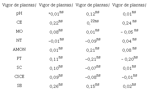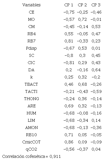 Para buscar relaciones no lineales entre todas las variables edáficas evaluadas y los parámetros de vigor en plantas de plátano, se realizó un análisis de los componentes principales de los cuales los 3 primeros explicaron el 62% de la variabilidad encontrada, porcentaje que coincide con lo reportado por Yanet al.(2000).