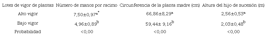 Los parámetros del cultivo tales como número de manos por racimo, circunferencia de la planta madre y la altura del hijo de sucesión fueron adecuados para separar lotes de vigor contrastantes.