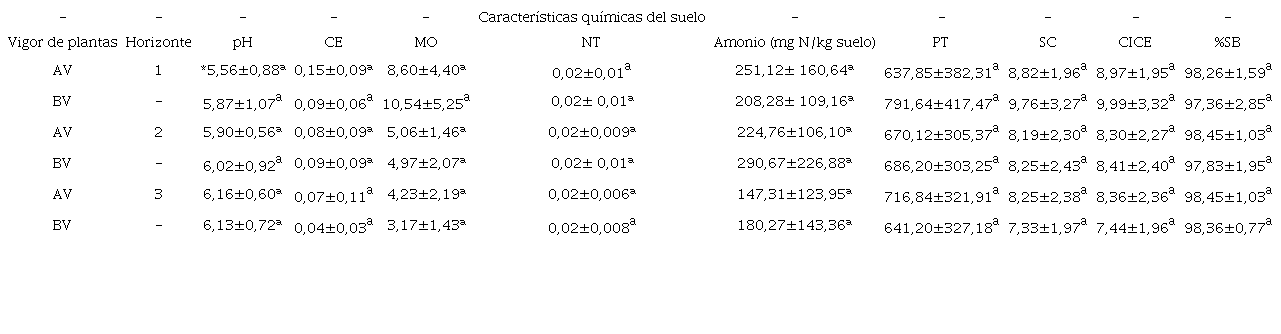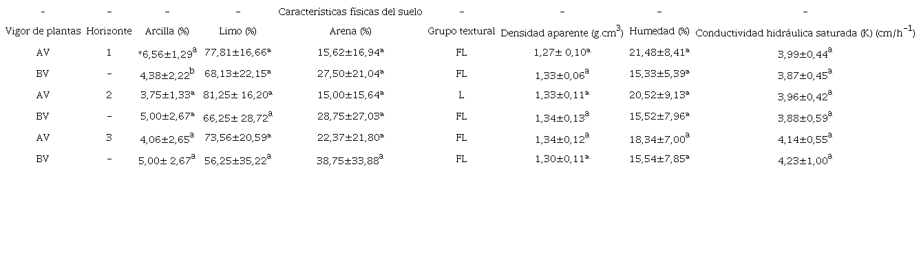 Los resultados para cada profundidad de suelo evaluada y lotes de vigor contrastantes para las propiedades físicas, químicas y biológicas se presentan en las Tablas 2, 3 y 4.