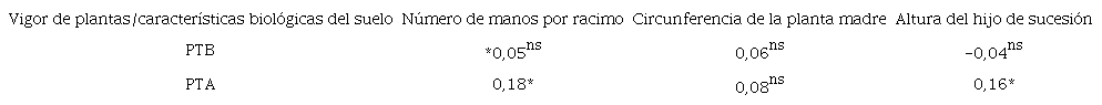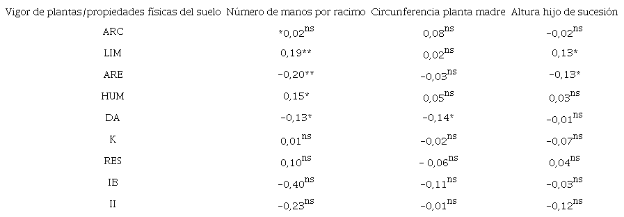 Adicionalmente, se observa una correlación positiva y significativa entre limo y humedad con el número de manos por racimo. De esta manera, se infiere que, conforme aumenten los contenidos de limo y porcentaje de humedad, se incrementa el número de manos por racimo. Esto se encuentra asociado fundamentalmente a que ambas propiedades intervienen en la dinámica de disponibilidad de nutrientes y facilidad de intercambio de cationes en el suelo (Rodríguezet al.2010a).
