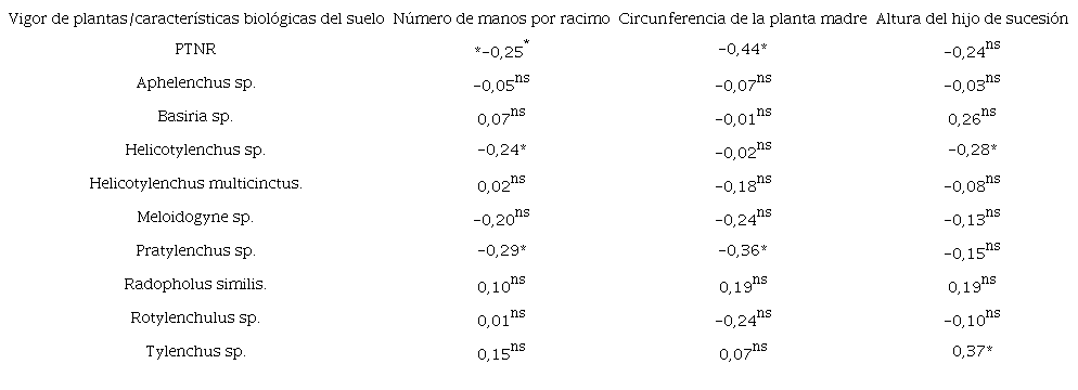 Adicionalmente, se encontró una correlación significativa y negativa entre la población total de fitonemátodos en raíces (PTNR) y las variables de vigor estudiadas (número de manos por racimo y circunferencia de la planta madre). En cuanto a los géneros de los nemátodos, se determinó una correlación negativa entreHelicotylenchussp, y el NMR y la AHS; entrePratylenchussp y el NMR y la CPM; lo que significa que conforme aumente la PTNR y los géneros de fitonemátodos indicados, disminuirán las características de vigor en el cultivo de plátano (Tabla 7).