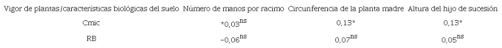 El número de manos por racimo, circunferencia del pseudotallo y altura del hijo de sucesión son parámetros que están altamente correlacionados con la producción o vigor de la plantación en banano o plátano (Rosaleset al.2008).