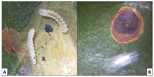 L. coffeellatiene una metamorfosis completa con 4 estados de desarrollo (huevo, larva, pupa y adulto). El estado de larva (Figura 1) es el único que causa daño a las plantas de café pues entran en la hoja y se alojan entre las células epidérmicas, alimentándose del tejido de parenquimático (Ruedaet al.2016). Conforme la larva crece, hace una galería en la lámina foliar, de tal manera que cuando poblaciones son abundantes, puede existir coalescencia de galerías y en consecuencia, defoliación (Figura 2).