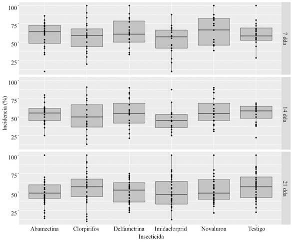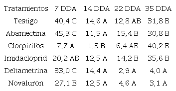En la Tabla 3 se detallan las medias del porcentaje de minas activas para diferentes fechas después de la aplicación (dda) de los insecticidas. Al momento de la aplicación el sitio experimental contaba con un porcentaje de minas activas de 23,5%. A los 7 dda se observó como las hojas que fueron aplicadas con clorpirifos fueron las que tuvieron menor cantidad de minas activas, pues representaron un 7,7%, seguido del imidaclorprid con un 20,2%. El tratamiento sin aplicación de insecticida y el asperjado con abamectina mostraron los mayores porcentajes de minas activas 40,4 y 45,3% respectivamente. Para el día 14 en todos los tratamientos se redujo la cantidad de minas activas en todos los tratamientos, con excepción del clorpirifos que fue el único que mostró diferencia estadística respecto a los otros. En las 2 últimas evaluaciones, las plantas en las que se aplicó clorpirifos, la incidencia de la plaga comenzó a aumentar, hasta llegar al día 35 con una cantidad igual a la del testigo; mientras que la deltametrina y el novaluron lograron mantener las poblaciones de larvas deL. Coffeelladisminuida, con un efecto lento de estas 2 moléculas, sobre la reducción de minas activas, aunque con el resultado de un periodo prolongado.