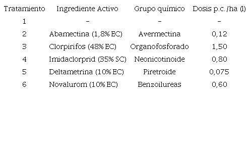 Se utilizó un diseño experimental irrestricto al azar para establecer 6 tratamientos, que incluía el testigo, (Tabla 1). Se realizaron 4 repeticiones para cada uno, en una parcela total fue de 48 plantas (96m2) y 36 útiles (72 m2). Se hizo una única aplicación el día 28 de enero del 2019 con 220 litros de agua por hectárea (y los respectivos insecticidas); la aplicación se realizó con una bomba de espalda de motor con dos boquillas H-5.