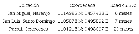 En el primer trimestre del 2019 se reportó presencia y afectación causada porL. coffeellaen algunas fincas de las localidades de Naranjo de Alajuela y Guadalupe en San José. Debido a una identificación previa del Instituto del Café de Costa Rica (ICAFE), se inspeccionaron fincas (Tabla 1) para observar características del manejo agronómico como el control de malezas, árboles de sombra, edad del cultivo, y arreglo de siembra. Además, se recolectaron hojas y se colocaron en bolsas de polietileno, que fueron llevadas al laboratorio del Centro de Investigaciones en Café (CICAFE) en Barva de Heredia donde se observaron por medio de un estereoscopio (Olympus SZX7) los detalles de los estadios del insecto.
