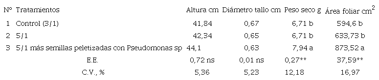 Entre el sustrato 3/1 y 5/1 sin la inoculación de Psedomonasp no existieron diferencias significativas, pero donde existió mayor volumen de abono orgánico la germinación fue un 9,97% superior. Resultados que pueden estar relacionados a lo expresado por Hernández et al. (2010) al referirse que el abono orgánico es un inoculante microbiano que favorece la germinación.