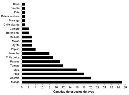 En cuanto a la diversidad de especies de aves por cultivo, se determinó que el cultivo más visitado fue el de mango, donde se observó la presencia de 29 especies de aves. A este cultivo le siguieron en orden de importancia, los cultivos de acerola (Malpighia emarginata), frijol y maíz, con la presencia de 20, 18 y 16 especies, respectivamente (Figura 1).