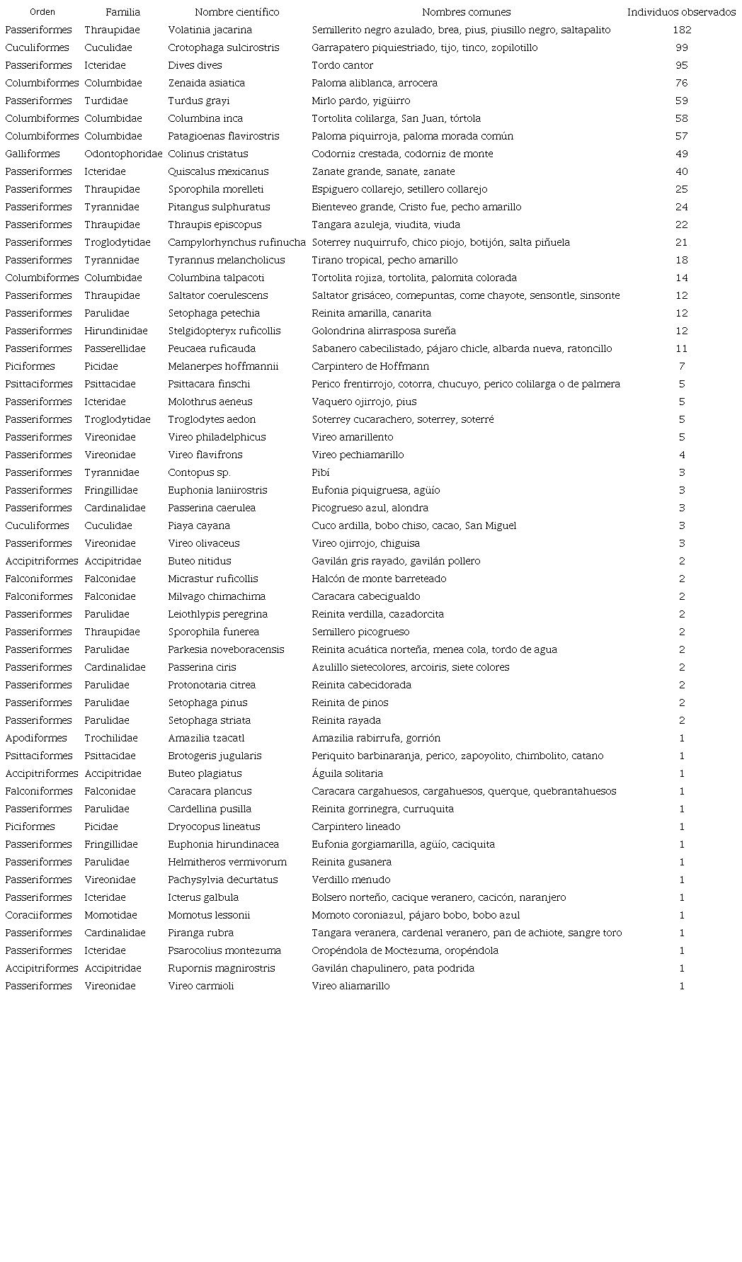 Las especies Volatina jacarina y Crotophaga sulcirostris fueron las más abundantes en la mayoría de los cultivos, con un total de 182 y 99 individuos registrados (18,8% y 10,2%), respectivamente. Las especies que le siguen con mayor abundancia fueron Dives dives (9,8%), Zenaida asiatica (7,9%), Turdus grayi (6,1%) Columbina inca (6%), Patagioenas flavirostris (5,9%), Colinus cristatus (5,1%) y Quiscalus mexicanus (4,1%), que en conjunto representan el 74% de los avistamientos.