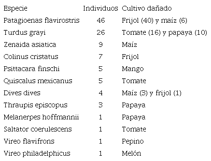 De las especies de aves presentes, 12 provocaron daños a los cultivos, en particular la paloma morada (P. flavirostris) de la que se observaron más individuos en los cultivos de frijol y maíz. La otra especie con más individuos fue el yigüirro (T. grayi) que expuso daños en frutos de tomate y papaya, seguida de la paloma aliblanca (Z. asiatica) en el cultivo de maíz.