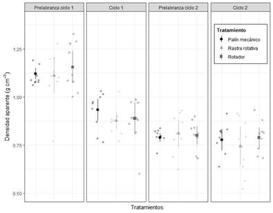 Al evaluar las diferentes propiedades físicas del suelo se encontraron respuestas del efecto de la labranza, los cuales provocaron una reducción en la densidad aparente a lo largo de los ciclos de cultivo. Para el final del segundo ciclo de cultivo se produjo una estabilización en la densidad aparente con respecto a la prelabranza del mismo, en los tratamientos con palín mecánico y rotador (Figura 4).