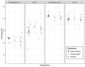 Dentro de los tratamientos, con la rastra rotativa se presentó un aumento lineal en la porosidad el cual comienza a estabilizarse para el final del segundo ciclo, este fue el tratamiento con un mayor aumento en la porosidad del suelo. El palín mecánico comienza con una respuesta más sigmoidal, pero decae para el final del segundo ciclo. El rotador por su parte generó un aumento lineal en la porosidad hasta la prelabranza del segundo ciclo, pero la porosidad disminuyó para el final del segundo ciclo.