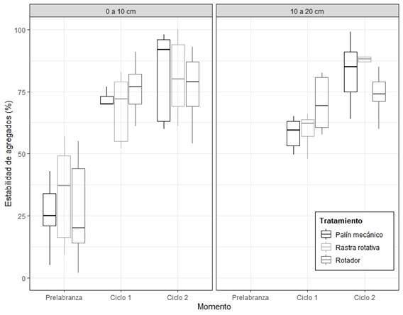 Este efecto se pudo deber al poder vibratorio del rotador donde a mayores profundidades puede ejercer un efecto sobre los agregados (Pal et al. 2016). Sin embargo, el efecto de compactación que ejerce la rastra también pudo afectar profundidades mayores a 10 cm por lo que la compactación pudo haber ayudado a mantener la estabilidad de los agregados (ALPEGO n.d.). Por otra parte, la baja perturbación con el palín mecánico mantiene una mayor proporción de macroagregados en el suelo (Sarrantonio y Molloy 2003) que aumentan la estabilidad de agregados detectada.