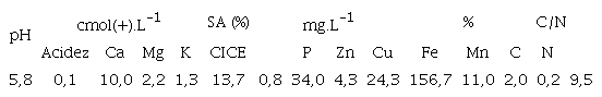 La pendiente promedio del terreno fue de 10%, con una textura franco arcillosa, y el contenido de materia orgánica promedio era de 2,9%. La presencia de pedestales pequeños (< 1 mm) demostró un grado de erosión leve. Inicialmente, el suelo presentó una densidad aparente de 1,13 g.cm-3 y 52% de porosidad.
