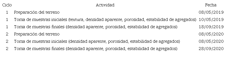 Las muestras fueron recolectadas antes y después de la preparación inicial del terreno y al final del ciclo de cultivo (Tabla 2). Se les realizaron los análisis físicos de densidad aparente, porosidad y estabilidad de agregados de 0 a 10 cm y de 10 a 20 cm de profundidad.