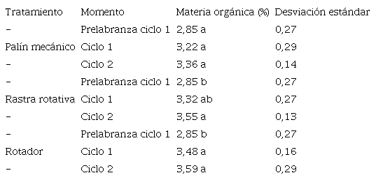 El contenido de materia orgánica fue el más bajo al momento de la prelabranza del terreno. Entre la prelabranza y el final del primer ciclo, el aumento más significativo obtenido fue con el rotador, seguido por la rastra rotativa. Con el palín mecánico, sin embargo, no se presentaron diferencias significativas y el aumento de materia orgánica fue más constante en el tiempo (Tabla 3), esto demuestra un efecto por parte de los implementos.