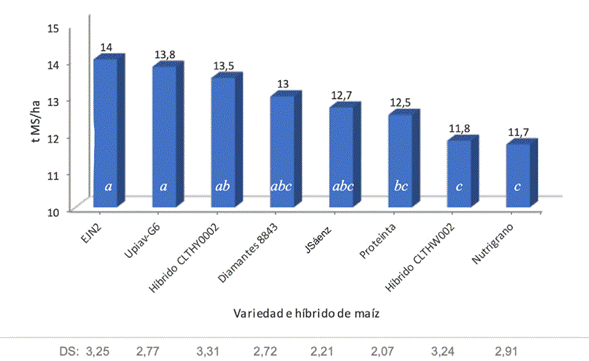 Con respecto a la composición química de los forrajes (MS, PC, FDN, FDA y CE), solamente las variables MS y PC resultaron significativas (p<0,05) entre los tratamientos, el resto de las variables y la digestibilidad in vitro de la MS no variaron (p>0,05) entre los materiales de maíz evaluados (Tabla 5).