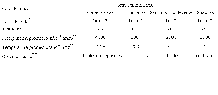 Características de los sitios experimentales. El estudio se realizó en 4 sitios con diferentes características agroecológicas: Estación Experimental de Los Diamantes (EELD) del Instituto Nacional de Innovación y Transferencia en Tecnología Agropecuaria (INTA) de Costa Rica, ubicada en Pococí, provincia Limón y en la Finca Experimental Interdisciplinaria de Modelos Agroecológicos (FEIMA) de la Universidad de Casta Rica (UCR), Sede del Atlántico, Turrialba, provincia Cartago. Los otros sitios se ubicaron en fincas comerciales, uno en San Luis de Monteverde, provincia Puntarenas y otro en Aguas Zarcas de San Carlos, provincia Alajuela.