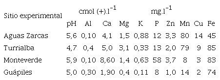 Los contenidos de Ca son bajos en todos los sitios, excepto en san Luis de Monteverde, donde el valor fue óptimo (8,6). Además, el contenido de Mg y K fue de medio a óptimo, excepto en Guápiles, donde los contenidos de estos nutrientes no superaron valores de 0,41 y 0,11, respectivamente.