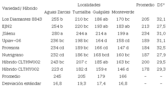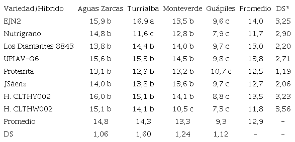 En Aguas Zarcas y Guápiles se encontraron más diferencias entre los tratamientos en comparación a las otras localidades. En el caso de Aguas Zarcas, la variedad Upiav-G6 (28,5%) fue superior (p<0,05) al resto de los materiales, mientras que las variedades EJN2, Proteinta y Nutrigrano, con valores que oscilaron entre 26,1 y 26,4%, superaron significativamente (p<0,05) a las variedades Los Diamantes 8843 y JSáenz (22,7%), y a los híbridos, los cuales alcanzaron valores entre 21,7 y 23,3%.