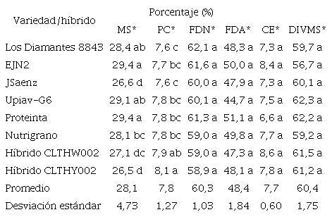 Fibra Detergente Neutro (FDN). En la Tabla 5, se detalla el valor promedio de FDN de los materiales evaluados, donde se observa que el promedio de las variedades costarricenses (60,7%) es semejante (p>0,05) al obtenido con los híbridos forrajeros (59%) seleccionados por CIMMYT para la producción de forraje.