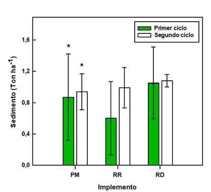 En el segundo ciclo de cultivo, la menor cantidad de sedimento colectado se obtuvo con el palín mecánico (0,94 ± 0,23 Ton ha-1), seguido por la rastra rotativa (0,99 ± 0,26 Ton ha-1) y el rotador (1,08 ± 0,08 Ton ha-1). Tampoco se presentaron diferencias significativas entre los implementos de labranza (p > 0,05) para este ciclo de cultivo (Tabla 1; Figura 3).