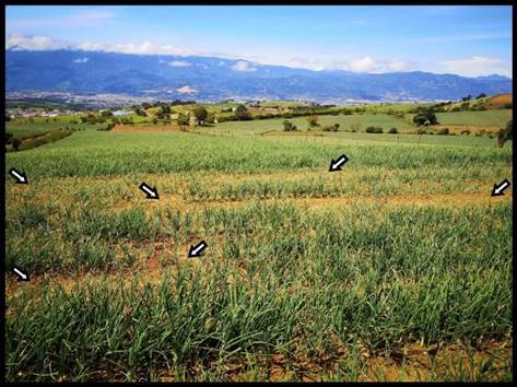 Una posible causa de esta tendencia fue un problema biótico que se presentó en un sector de la plantación. Debido al diseño del ensayo, una repetición con la rastra rotativa y otra repetición con el palín mecánico coincidieron con un sector donde las plantas presentaron clorosis, un crecimiento reducido y mortalidad (Figura 4). Esta condición afectó el tamaño de los bulbos y de forma indirecta, la cantidad de sedimento colectado en dichas unidades experimentales, en concordancia con lo reportado por Isabirye et al. (2007) donde menores rendimientos del camote (Ipomoea batatas L.) representaron menores cantidades de sedimentos perdidos como SLCH.