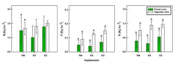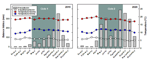 Los valores obtenidos para N, P, y K se detallan en la Figura 5. No se encontró diferencias significativas asociadas a los factores Ciclo (C), Implemento (I), o su interacción (C x I) para los contenidos de N, mientras que los elementos P y K presentaron diferencias asociadas solamente al factor C (Tabla 2; p-value <0,05). Estas diferencias se pudieron asociar con la variabilidad en la temperatura, la evapotranspiración y la precipitación pluvial en ambos ciclos de cultivo, donde observó un incremento en la magnitud de las lluvias durante los meses de mayo, junio y septiembre del segundo ciclo de cultivo (Figura 6), lo cual pudo haber tenido un efecto en el crecimiento de la cebolla y la dinámica de los elementos en el suelo, lo que de forma indirecta podría afectar la cantidad de sedimento adherido al bulbo.