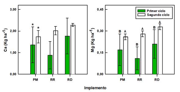 Los resultados obtenidos para el Ca y el Mg se detallan en la Figura 7. No se encontraron diferencias significativas asociadas al implemento de labranza, el ciclo de cultivo o su interacción para el Ca, mientras que en el caso del Mg se observó diferencias significativas asociadas al factor ciclo de cultivo (Tabla 2; p-value <0,05). Se encontró valores máximos de pérdida de nutrimentos por cosecha para estos dos elementos de hasta 2,28 ± 0,07 kg de Ca y 0,33 ± 0,02 kg de Mg por hectárea por ciclo.