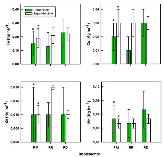 Finalmente, las cantidades de Fe, Cu, Zn y Mn que se pierden por labores de cosecha se resumen en la Figura 8. No se encontraron diferencias significativas asociadas al implemento de labranza, el ciclo de cultivo o su interacción para los cuatro microelementos (Tabla 3; p-value >0,05). Se encontró valores máximos de pérdida de hasta 0,23 ± 0,10 kg de Fe, 0,03 ± 0,01 kg de Cu, 0,02 ± 0,01 kg de Zn y 0,07 ± 0,04 kg de Mn por hectárea por ciclo de cultivo de la cebolla. Dichos valores resultaron significativamente más bajos comparación con los obtenidos para el N, K, y Ca (Figuras 5 y 7). Sin embargo, estas cantidades representan la fracción intercambiable de los elementos en el suelo (Bertsch et al. 2005), por lo que es esperar que la pérdida total sea aún mayor.