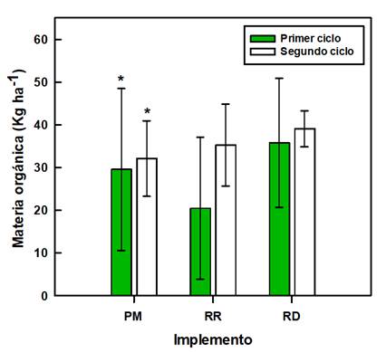 En el presente estudio, se cuantificó las pérdidas totales de la materia orgánica que salen del sembradío por la cosecha. Las cantidades de materia orgánica obtenidos se detallan en la Figura 9. No se encontró diferencias significativas asociadas a los dos factores evaluados y su interacción (Tabla 4; p-value > 0,05).