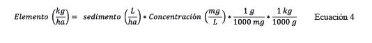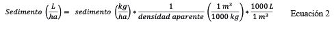 1) Se transformó la masa de sedimento (kg ha-1) en volumen (L ha-1) con la correspondiente densidad aparente del suelo (Mg m-3 o 1000 kg m-3) mediante la siguiente igualdad: