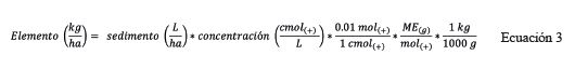 2) Si la concentración del elemento fue expresada en cmol(+) L-1 (Ca, Mg, K) se calculó la cantidad del elemento mediante su correspondiente masa equivalente (ME(g) ), que resultó de dividir su masa molar por la carga correspondiente. El cálculo final se realizó de esta forma: