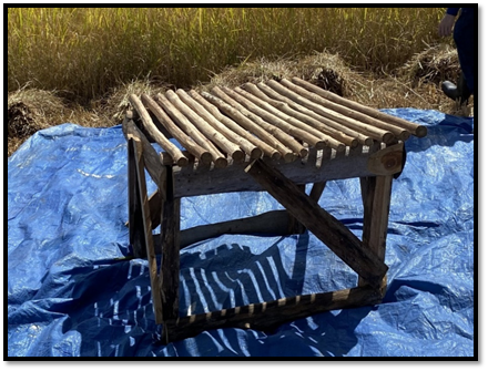 The spraying was conducted during milky stage. To identify it, approximately 100 panicles were tested resulting in around 24 being in milky stage. The crop harvest was manual, using a structure with wooden support and horizontal bars (Figure 3), especially made for that purpose. The rice grains were separated from the plant by hitting it on the wooden structure three times on each side of the panicle and then recollected in plastic canvas located right below. Ultimately, grains were placed in classified bags according to treatments.