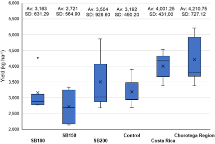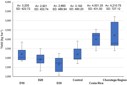 The rice yield of all treatments and the control were measured based on husked rice with impurities. After harvest, the rice obtained was packed in pouches labeled according to the experimental unit. A digital scale T-Scale MBW-300 model with ± 20 g precision was used. Also, the average yield was compared to the average yield in the Chorotega region and Costa Rica over the last 11 years, being 4,001.25 kg ha-1 and 4,210.75 kg ha-1, respectively (CONARROZ 2019, CONARROZ 2023, INEC 2017).