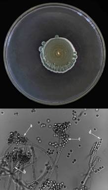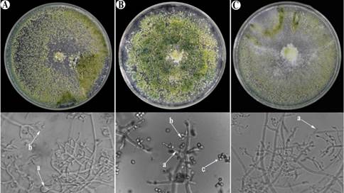 Inicialmente, el hongo en el plato Petri mostró un color blanco que posteriormente fue adquiriendo una tonalidad verde con una esporulación generalizada. Las colonias presentaron de dos a tres anillos concéntricos bien definidos: uno blanco que correspondió al micelio y otros verdes que representaban los conidios. La pigmentación de los aislamientos varió de una tonalidad verde claro a verde oscuro típico de este género.