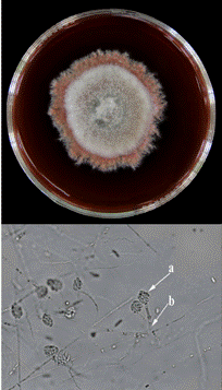 Asimismo, presentó abundantes microconidios, unicelulares los cuales estaban ubicados en falsas cabezas (Figura 4a) a partir de monofiálides alargadas sobre conidióforos (Figura 4b) no ramificados. Este aislamiento presentó homología de secuencia y cobertura del 100% (688pb/688pb) de la región TEF1-α con F. solani (KF255484) reportado en Los Países Bajos y 100% de homología de la región ITS con F. solani (FJ224382) reportado en Puerto Rico.