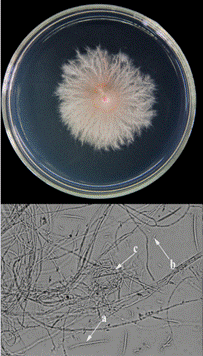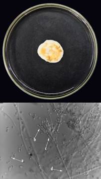 Talaromyces sp. (Tal) se aisló de muestras de suelo procedentes del cantón de Guácimo. Este hongo mostró un diámetro de 3 cm a partir del quinto día de incubación, presentó un micelio de color blanco que posteriormente cambió a color amarillo (Figura 7) con una rápida esporulación en pocos días. Sus conidióforos eran largos y cilíndricos, relativamente estrechos (Figura 7c). Además, presentó fiálides unicelulares dispuestas en verticilos no ramificados (Figura 7b) a partir de las cuales se producen conidios de forma elipsoidal (Figura 7a).
