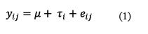 Donde 𝑦 𝑖𝑗 es el rendimiento del i-ésimo (i = 1, 2) tratamiento en la j-ésima unidad experimental (j = 1,…, n); 𝜇 es la media general del rendimiento; 𝜏 𝑖 : es el efecto fijo del i-ésimo tratamiento y 𝑒 𝑖𝑗 representa el error residual, se supone que esta normalmente distribuido con media cero y varianza 𝜎 2 , además se supone que la cov ( 𝑒 𝑖𝑗 , 𝑒 𝑖´𝑗´ )=0 Ɐ ij ≠ i´j´.