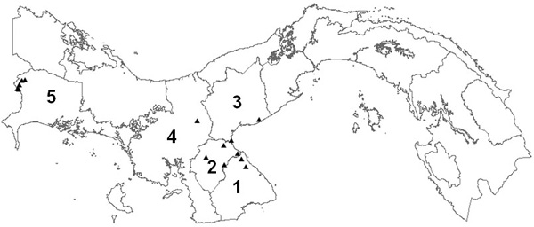 Los números 1, 2, 3, 4, y 5, corresponden a las provincias de Los Santos, Herrera, Coclé, Veraguas y Chiriquí, respectivamente.