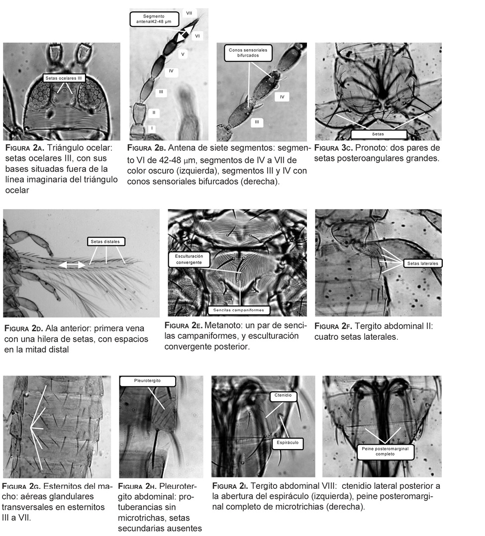 La identificación y diferenciación de T. palmi de otras especies conocidas del género Thrips, se llevó a cabo según los caracteres morfológicos observados en este estudio, los cuales indicamos a continuación. Uno de los caracteres típicos de este género es la presencia de dos pares de setas ocelares. En el caso de T. palmi, esta especie presentó setas ocelares gruesas y negruzcas (Figura 2A), ubicadas fuera del triángulo ocelar y la línea exterior tangente, mientras que su cuerpo era amarillo claro sin manchas de color grisáceo o pardo. Adicionalmente, mostró antenas de siete segmentos. El tercer y cuarto poseían un cono sensorial bifurcado, el VI medía 42-48 µm de longitud, y los segmentos antenales IV-VII eran de color oscuro (Figura 2B). En el caso del género Thrips, el número de segmentos antenales es de 7-8. Por otro lado, el pronoto de esta especie presentó dos pares de setas posteroangulares (Figura 2C). El ala anterior, presentó una primera vena con una hilera de setas, con espacios en la mitad distal (Figura 2D). El metanoto de este insecto, mostró una estría mesal y, por lo general, convergente, con un par de poros metanotal (sencilas campaniformes) (Figura 2E). Por otro lado, el tergito abdominal II con cuatro setas laterales (Figura 2F). En relación a los especímenes machos, los esternitos III-VII tuvieron un área glandular transversal (Figura 2G). En cuanto a los pleurotergitos, estos se observaron sin setas (Figura 2H), mientras que el tergito adbominal VIII, presentó ctenidio abdominal posterior al espiráculo, y peine completo (Figura 2I).