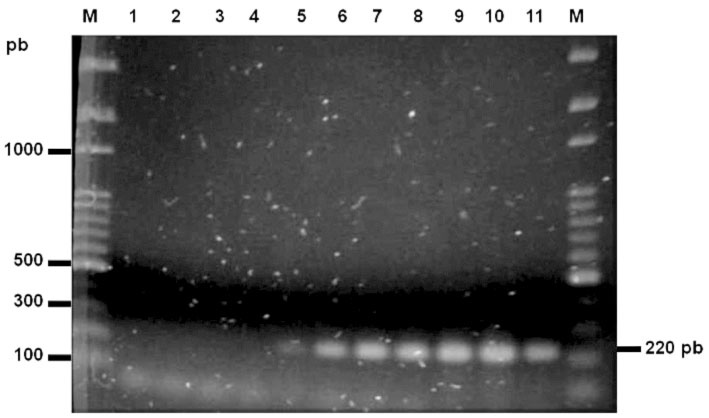 Los productos amplificados por PCR (8 µl), se sometieron a electroforesis en un gel de agarosa al 1,5% en tampón TBE 1x (89 mM Tris, 89 mM ácido bórico, 2 mM EDTA, pH 8,3), a 56 voltios durante aproximadamente tres horas. A continuación, los productos se tiñeron con bromuro de etidio (0,2 µg/ml), y se visualizaron y fotografiaron bajo luz ultravioleta. El tamaño de los fragmentos amplificados se determinó por comparación con un marcador de peso molecular de 100 pb DNA Molecular Weight Ladders (Amresco, Solon, OH, USA).