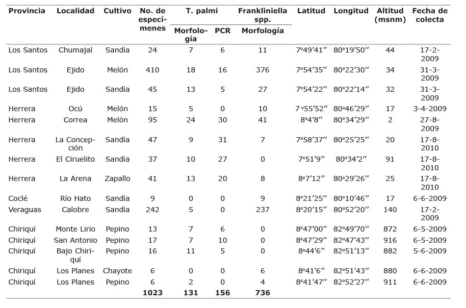 Doscientos ochenta y siete especímenes (28,05%; n=1023) fueron identificados como T. palmi mediante morfología (131 especímenes) y PCR (156 especímenes), y los mismos procedían de diferentes localidades de las provincias de Los Santos, Herrera, Veraguas y Chiriquí (Cuadro 1). En este sentido, T. palmi había sido reportado previamente en una localidad de la provincia de Herrera (MIDA 2006). Por lo tanto, este es el primer reporte de la presencia de esta plaga en las provincias de Los Santos, Veraguas, y Chiriquí, según la literatura consultada. Este insecto no fue encontrado en la provincia de Coclé, debido probablemente al reducido número de especímenes analizados en esta región (Cuadro 1).
