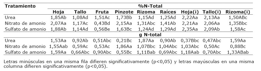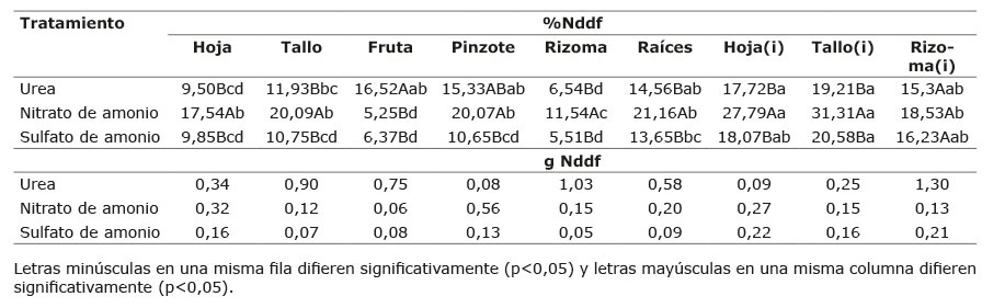 En los contenidos (gramos) de Nddf en la interacción entre los tratamientos U, NA y SA con los diferentes tejidos, no se presentaron diferencias significativas. Se observa que el tratamiento de U, en la fruta obtuvo 0,75 g en comparación con los de NA y SA, con 0,06 y 0,08 g, y los superó en 12,5 y 9,4 veces más de Nddf, respectivamente. En los tejidos de rizoma y raíces del tratamiento con U, se obtuvo una cantidad de Nddf de 1,03 y 0,58 g, respectivamente, con respecto a 0,15 y 0,05 g para el NA y de 0,20 y 0,09 g para el de SA, en ambos tejidos, respectivamente, lo que describe, una mayor acumulación de N en el tratamiento de U en el rizoma y raíces, de 6,9 a 5,2 y 11,6 a 6,4 veces más de Nddf que las otras dos fuentes. Tal comportamiento podría tener una explicación en la nutrición de planta, debido a que la formas de N disponibles: el nitrato (NO3-) y amonio (NH4+) deberían ser entendidos como dos nutrientes diferentes debido a su comportamiento dentro de la planta, donde se relaciona el efecto del NH4+ con lo verdoso de esta, mientras el NO3- produce crecimiento o vigor de las plantas (Mengel y Kirbby 1982, Mills y Jones 1996, Ramírez 2001).