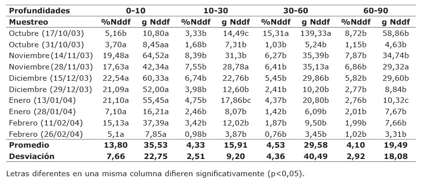 Hubo diferencias (p<0,05) en la cantidad de Nddf acumulados de acuerdo con la profundidad de muestreo del perfil del suelo (Cuadro 2). Se determinaron diferencias significativas con respecto a las profundidades y al momento del muestreo. Las formas de N disponible obtenidas en porcentaje de Nddf, con valores promedios a las profundidades evaluadas de 0-10 cm; 10-30 cm, 30-60 cm y de 60-90 cm fueron de 13,80±7,66%; 4,33±2,51%; 4,53±4,36% y 4,10±2,92%, respectivamente. En cambio, para los gramos recuperados de Nddf, los valores obtenidos fueron de 35,53±22,75 g; 15,91±9,20 g; 29,50±40,49 g y 19,50±18,08 g, respectivamente.